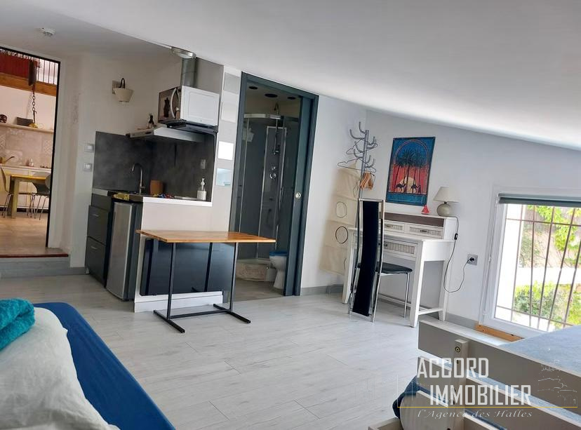Le second appartement, situé au premier étage, développe une surface de 27 m² et bénéficie d’une terrasse privative de 23 m². Très lumineux, exposé sud-ouest, il se compose d’un séjour avec cuisine équipée, d’une chambre mansardée, d’une salle d’eau et d’un WC indépendant. Climatisé et disposant de compteurs indépendants, ce logement est actuellement loué dans le cadre d’un bail nu, assurant un revenu locatif en place.